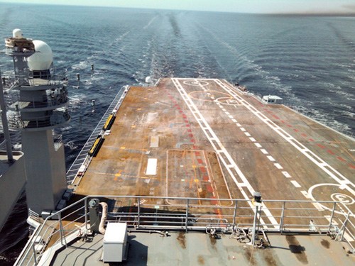 在這艘排水量達4.54萬(wàn)噸的前蘇聯(lián)航母上,除了俄羅斯北方造船廠(chǎng)(該廠(chǎng)對這艘航母進(jìn)行了改裝)的代表之外,還有印度海軍軍官。