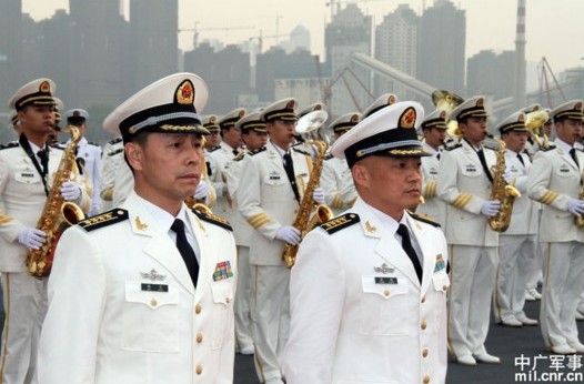 中國第一艘航空母艦遼寧艦艦長(cháng)張崢(前右)政委梅文(前左)