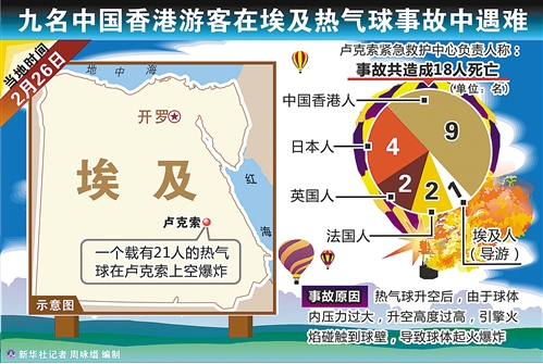 2月26日,在盧克索附近,救援人員在發(fā)生熱氣球爆炸的事故現場(chǎng)查看熱氣球殘骸。