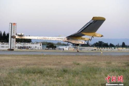 當地時(shí)間5月3日清晨6時(shí)12分,美國宇航局位于加州山景城莫菲特機場(chǎng),瑞士太陽(yáng)能飛機“太陽(yáng)能驅動(dòng)”號起飛,開(kāi)始歷史性的飛越美國大陸之旅!z影:陳鋼