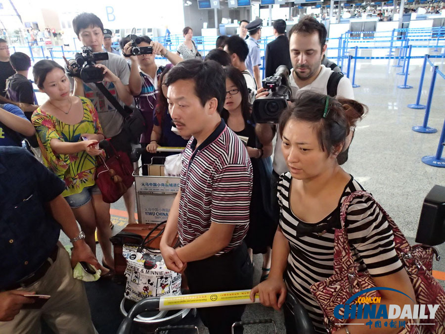 7月8日,在韓亞航空舊金山墜機事故中罹難的中國乘客王琳佳的父親(中)和母親(右)在上海浦東機場(chǎng)等候辦理乘機手續。(高爾強 攝)
