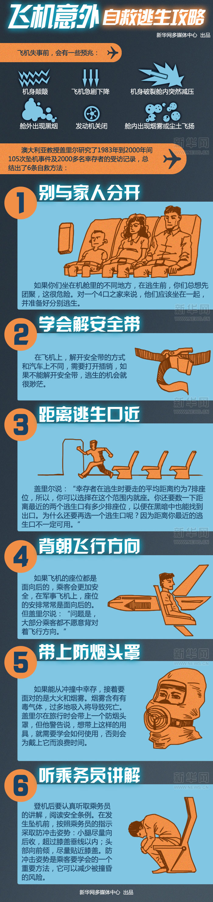 澳大利亞教授蓋里爾研究了1983年到2000年間105次墜機事件、2000多名幸存者的受訪(fǎng)記錄,總結出6條自救方法。
