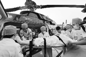昨日早上5時(shí)整,999直升機從密云機場(chǎng)起飛;5時(shí)23分,急救直升機抵達999清河急救中心停機坪。5分鐘后,救護車(chē)載著(zhù)老人抵達!奥c(diǎn)!慢點(diǎn)!讓開(kāi)車(chē)門(mén),小心直升機尾翼!”一位渾身包著(zhù)繃帶、戴著(zhù)頸托的老人被抬出了救護車(chē),老人緊閉雙眼,顯得十分虛弱。擔架上的老人被小心翼翼地移上直升機。旋即,直升機騰空而起,前往天津濱海國際機場(chǎng)。