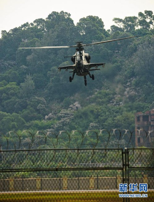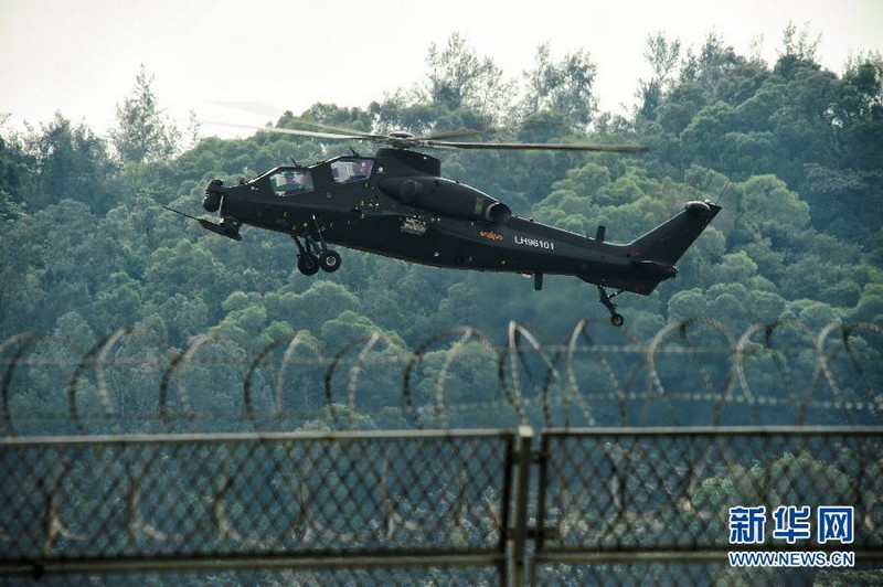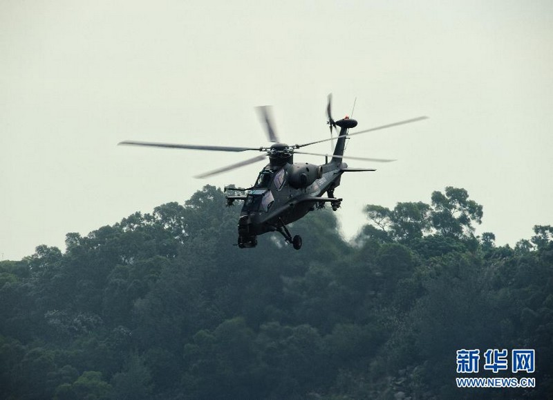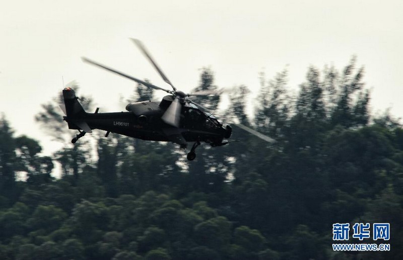 2012年11月11日,國產(chǎn)武直10武裝直升機在珠海三灶機場(chǎng)進(jìn)行飛行訓練。當日,我國自主研制生產(chǎn)的武直10武裝直升機在珠海三灶機場(chǎng)進(jìn)行了約20分鐘的適應性飛行訓練,做出倒飛、萊維斯曼機動(dòng)、高速大角度俯沖、低空小半徑盤(pán)旋等動(dòng)作,展現出其優(yōu)異性能,引來(lái)航展現場(chǎng)觀(guān)眾頻頻喝彩。楊光 攝 圖片來(lái)源:新華網(wǎng)