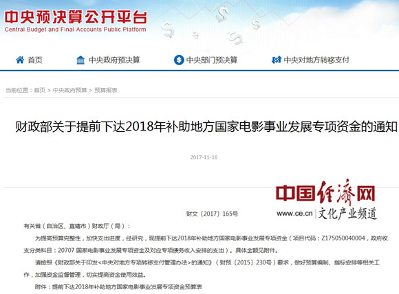 財政部關(guān)于提前下達2018年補助地方國家電影事業(yè)發(fā)展專(zhuān)項資金的通知