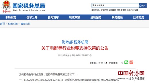 經(jīng)濟日報-中國經(jīng)濟網(wǎng)北京5月20日訊 近日,國家稅務(wù)總局官網(wǎng)發(fā)布《關(guān)于電影等行業(yè)稅費支持政策的公告》(以下簡(jiǎn)稱(chēng)《公告》),支持電影等行業(yè)發(fā)展。