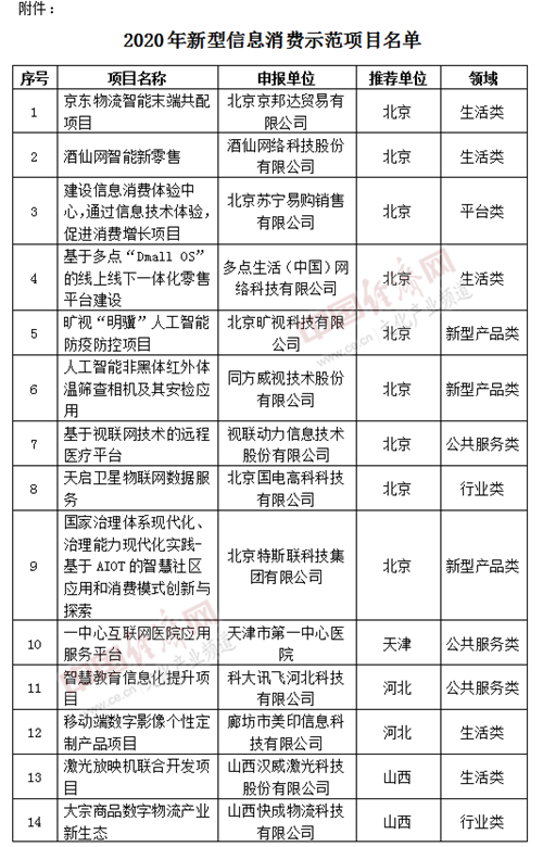 經(jīng)濟日報-中國經(jīng)濟網(wǎng)北京8月11日訊 日前,工業(yè)和信息化部公示了2020年新型信息消費示范項目,共100個(gè)項目入選。
