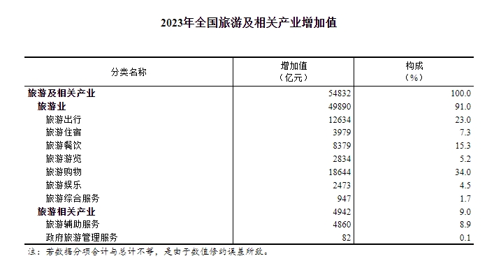 從內部構成看,旅游業(yè)增加值為49890億元,占旅游及相關(guān)產(chǎn)業(yè)增加值比重為91.0%,比上年提高1.7個(gè)百分點(diǎn)。旅游相關(guān)產(chǎn)業(yè)增加值為4942億元,占旅游及相關(guān)產(chǎn)業(yè)增加值比重為9.0%,比上年下降1.7個(gè)百分點(diǎn)?!?/p>