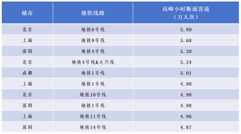 早晚高峰時(shí)期,哪條地鐵線(xiàn)乘客最多?根據《報告》,從線(xiàn)路來(lái)看,高峰小時(shí)斷面客流最高的10條線(xiàn)路依次是:北京地鐵6號線(xiàn)5.80萬(wàn)人次、上海地鐵9號線(xiàn)5.68萬(wàn)人次、深圳地鐵4號線(xiàn)5.38萬(wàn)人次、北京地鐵4號線(xiàn)&大興線(xiàn)5.24萬(wàn)人次、成都地鐵1號線(xiàn)5.01萬(wàn)人次、上海地鐵1號線(xiàn)4.98萬(wàn)人次、北京地鐵10號線(xiàn)4.98萬(wàn)人次、深圳地鐵1號線(xiàn)4.98萬(wàn)人次、上海地鐵11號線(xiàn)4.96萬(wàn)人次、深圳地鐵14號線(xiàn)4.87萬(wàn)人次。