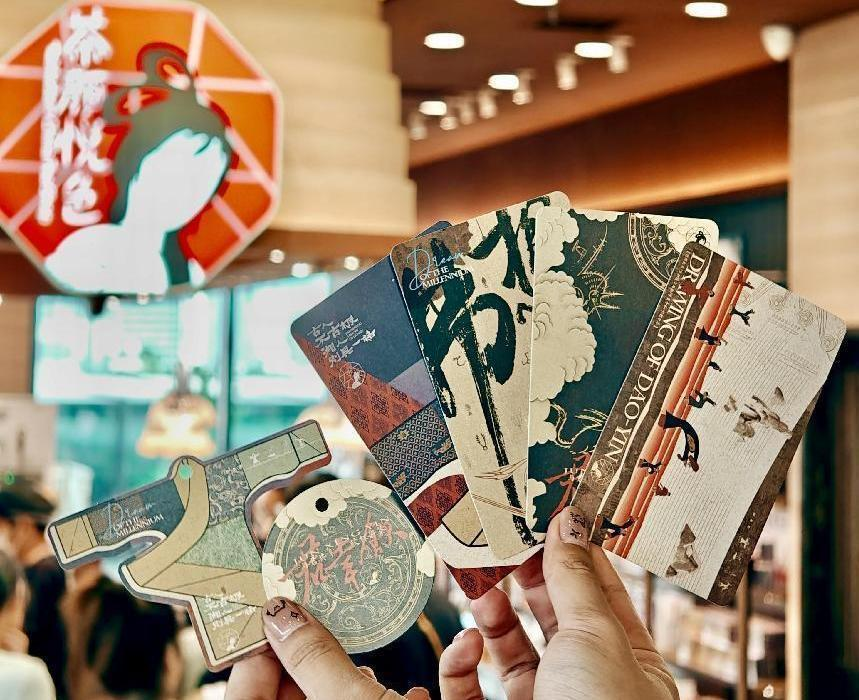 “我們還將湖南博物院藏的‘君幸食’貍貓紋漆食盤(pán)、朱紅菱紋羅絲錦袍等二次創(chuàng )作,制作成異形書(shū)簽和明信片,顧客朋友們可以在門(mén)店免費領(lǐng)取?!眲⑶煞冀榻B道。據了解,明信片一上架便被“搶斷貨”,很多游客表示“去了三次都沒(méi)拿到”,稱(chēng)其為“茶顏悅色史上最難拿到的明信片”。