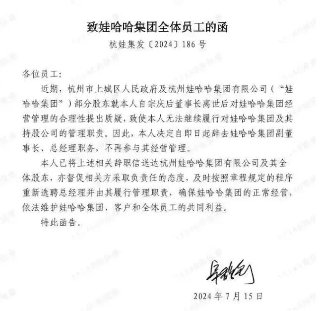 掌權142天后,宗馥莉辭職了?7月18日,一封署名宗馥莉的《致娃哈哈集團全體員工的函》在網(wǎng)上流傳。內容顯示,三天前的15日,娃哈哈集團副董事長(cháng)、總經(jīng)理宗馥莉,因杭州市上城區人民政府及娃哈哈集團部分股東對其經(jīng)營(yíng)管理的合理性提出質(zhì)疑,導致無(wú)法履行管理職責,遂辭去上述職位,不再參與公司的經(jīng)營(yíng)管理。