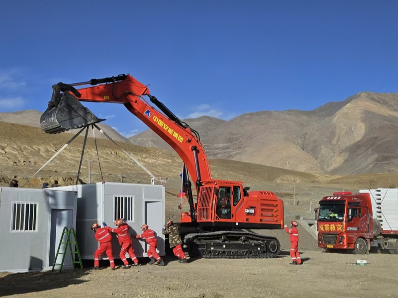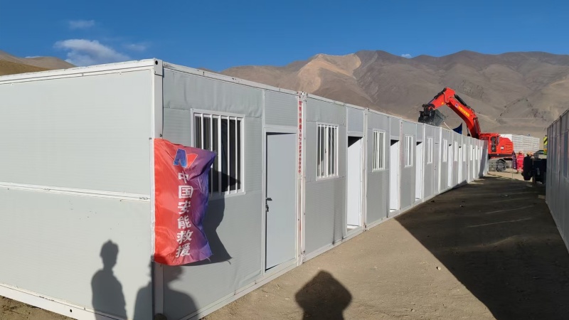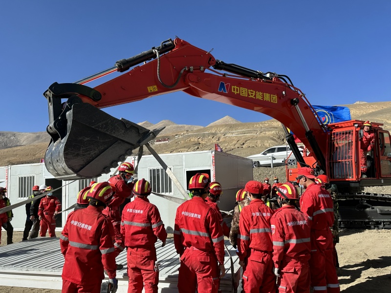 1月9日,在前方指揮部的統一調度下,繼完成受損房屋搜尋、用電需求保障、安置帳篷搭設、協(xié)助轉運重傷員等任務(wù)后,為了保障受災群眾溫暖過(guò)冬,中國安能在嘎旦村、玉白村方向組織開(kāi)展場(chǎng)地平整作業(yè),并進(jìn)行活動(dòng)板房的搭設。在嘎旦村投入60余人、10余臺重型救援裝備全力投入板房搭設工作。過(guò)程中,挖掘機、吊機等重型裝備與救援人員共同協(xié)作,搭建工作進(jìn)展迅速。