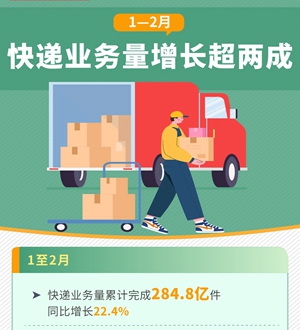 1至2月,快遞業(yè)務(wù)量保持快速攀升,累計完成284.8億件,同比增長(cháng)22.4%。