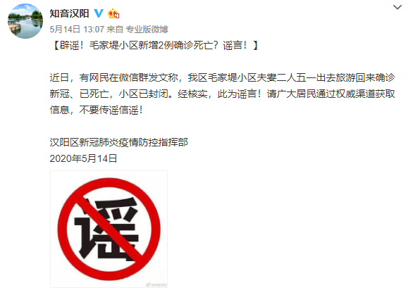 據武漢市漢陽(yáng)區委宣傳部官方微博5月14日消息,武漢市漢陽(yáng)區新冠肺炎疫情防控指揮部稱(chēng),經(jīng)核實(shí),網(wǎng)傳“漢陽(yáng)區毛家堤小區一對夫妻五一出游后確診新冠肺炎,已死亡,小區已封閉?!钡刃畔⒕鶠橹{言。請廣大居民通過(guò)權威渠道獲取信息,不傳謠信謠。