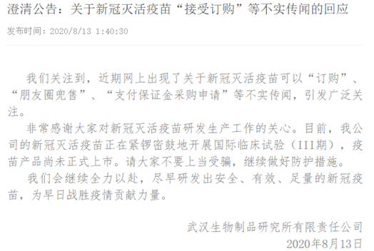 經(jīng)濟日報-中國經(jīng)濟網(wǎng)8月13日訊(記者朱國旺 郭文培)近期,網(wǎng)上出現了關(guān)于新冠滅活疫苗可以“訂購”、“朋友圈兜售”、“支付保證金采購申請”等不實(shí)傳聞,引發(fā)廣泛關(guān)注。8月13日,武漢生物制品研究所有限責任公司對此澄清:“目前,我公司的新冠滅活疫苗正在緊鑼密鼓地開(kāi)展國際臨床試驗(III期),疫苗產(chǎn)品尚未正式上市。請大家不要上當受騙,繼續做好防護措施?!?nbsp;