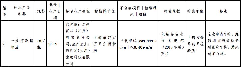 經(jīng)濟日報-中國經(jīng)濟網(wǎng)9月25日訊(記者 韓璐)  上海市藥品監督管理局23日發(fā)布的抽檢公告顯示,由名創(chuàng )優(yōu)品(廣州)有限責任公司代理的指甲油添加禁用物質(zhì)三氯甲烷,并且經(jīng)企業(yè)申請復檢后結果仍不合格。 檢驗結果顯示,該產(chǎn)品中三氯甲烷的含量高達589.449μg/g,相比《化妝品安全技術(shù)規范》(2015年版)中規定的檢測限值超標1400多倍。