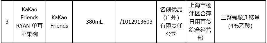 今年6月,上海市市場(chǎng)監管局網(wǎng)站發(fā)布的《2019年上海市兒童用餐具(密胺餐具)質(zhì)量監督抽查結果》顯示,標稱(chēng)名創(chuàng )優(yōu)品(廣州)有限責任公司生產(chǎn)的標稱(chēng)KaKao Friends RYAN 單耳蘋(píng)果碗(規格型號:380mL)被檢出三聚氰胺遷移量(4%乙酸)項目不合格。