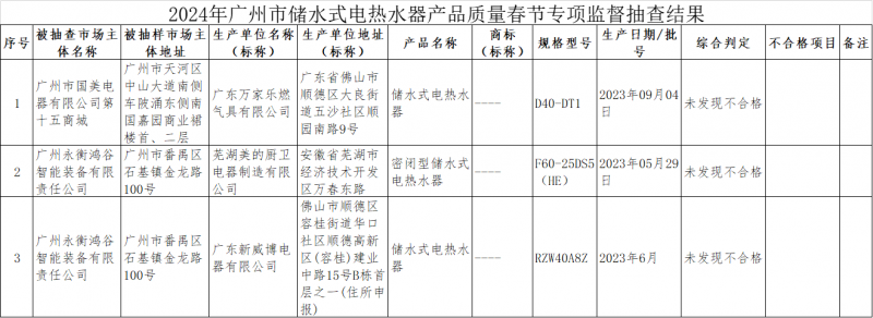 2024年廣州市儲水式電熱水器產(chǎn)品質(zhì)量春節專(zhuān)項監督抽查結果