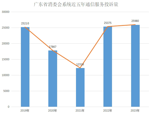 《報告》顯示,2019年至2023年,廣東省消委會(huì )系統共收到通信服務(wù)投訴106750件,占投訴總量的5.12%,呈現出先降后升的“V”字走勢。其中,前3年(2019年至2021年)相關(guān)投訴持續下降,從25210件降至12318件,平均降幅近三成。但隨著(zhù)通信服務(wù)市場(chǎng)競爭日趨激烈、業(yè)務(wù)更加多元,2022年起通信投訴再度飆升,投訴量達25375件,同比上升106.00%,而2023年維持高位(25980件)。