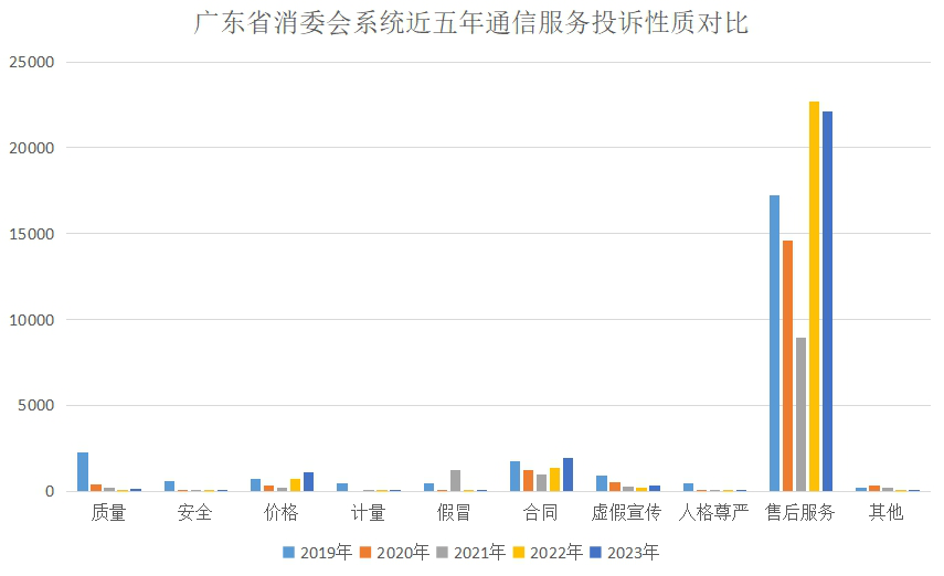 從投訴類(lèi)別來(lái)看,近5年通信服務(wù)投訴95%以上集中在移動(dòng)電話(huà)服務(wù),與當前通信業(yè)發(fā)展現狀相符(2023年廣東固話(huà)、移動(dòng)電話(huà)用戶(hù)數比例約為1:10)。從投訴性質(zhì)來(lái)看,消費者反映的問(wèn)題主要集中在售后服務(wù)、合同和價(jià)格3類(lèi),其中售后服務(wù)問(wèn)題最為集中,占投訴總量的80.19%,是通信服務(wù)類(lèi)投訴增長(cháng)變化的主要因素。從地區分布來(lái)看,通信服務(wù)投訴集中在消費活躍的珠三角地區,主要與經(jīng)濟發(fā)展狀況、人員密集程度相關(guān)。