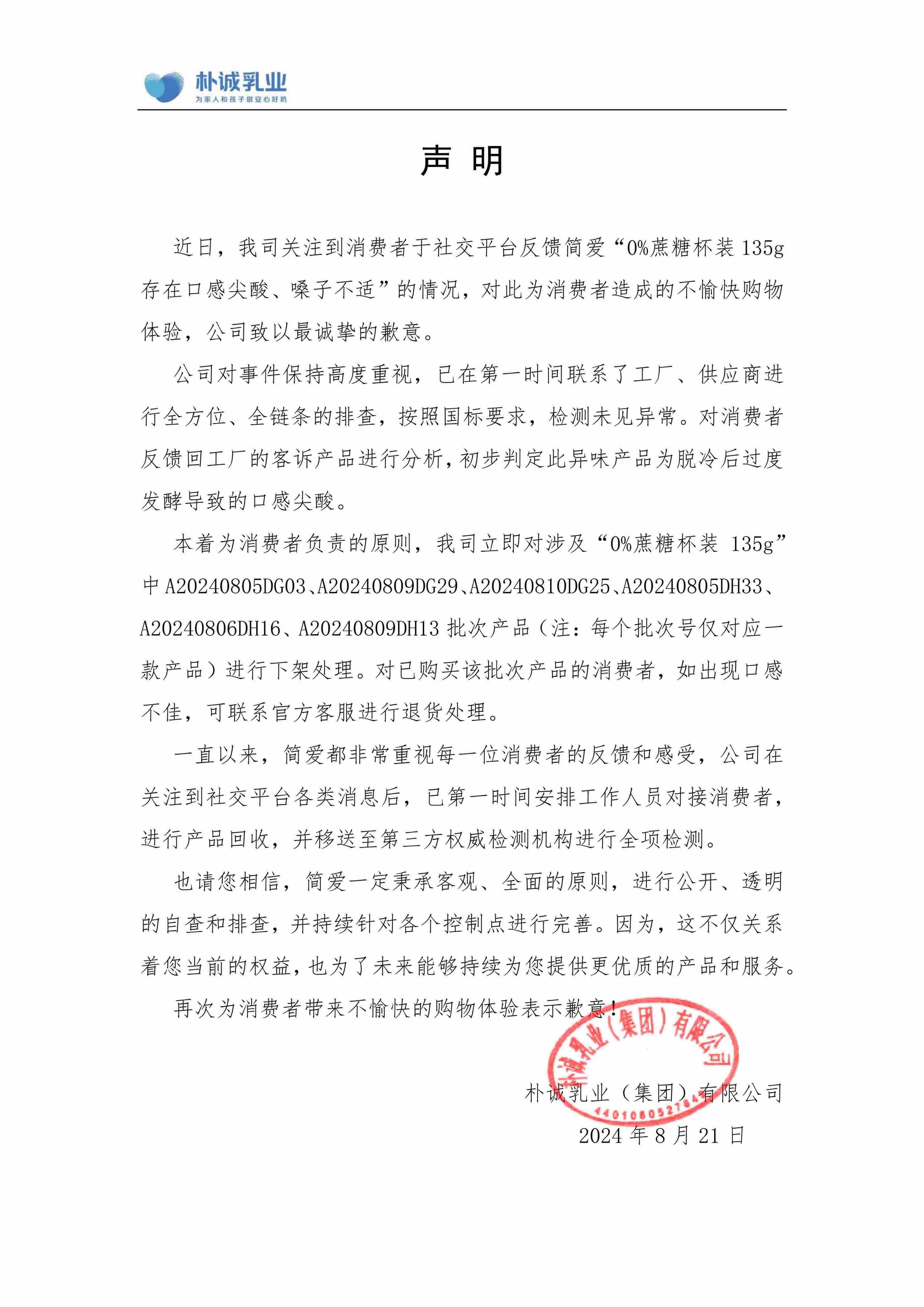 其在向記者發(fā)送的官方聲明中稱(chēng),公司已在第一時(shí)間聯(lián)系了工廠(chǎng)、供應商進(jìn)行全方位、全鏈條的排查,按照國標要求,檢測未見(jiàn)異常。對消費者反饋回工廠(chǎng)的客訴產(chǎn)品進(jìn)行分析,初步判定此異味產(chǎn)品為脫冷后過(guò)度發(fā)酵導致的口感尖酸。本著(zhù)為消費者負責的原則,該司立即對涉及“0%蔗糖杯裝135g”中A20240805DG03、A20240809DG29、A20240810DG25、A20240805DH33、A20240806DH16、A20240809DH13批次產(chǎn)品進(jìn)行下架處理。對已購買(mǎi)該批次產(chǎn)品的消費者,如出現口感不佳,可聯(lián)系官方客服進(jìn)行退貨處理。