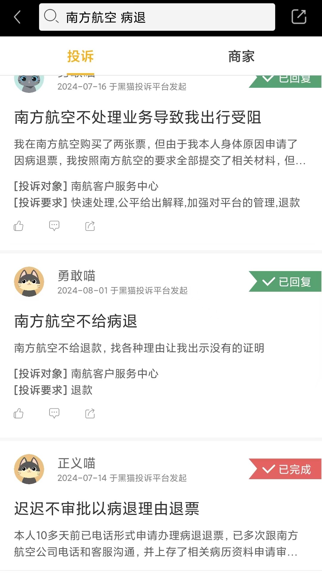 8月26日,記者在黑貓投訴平臺以“南方航空 病退”為關(guān)鍵詞搜索發(fā)現,共有272起相關(guān)投訴,反映的問(wèn)題涉及審核慢、客服人員不專(zhuān)業(yè)、病退申請無(wú)法撤回修改等。