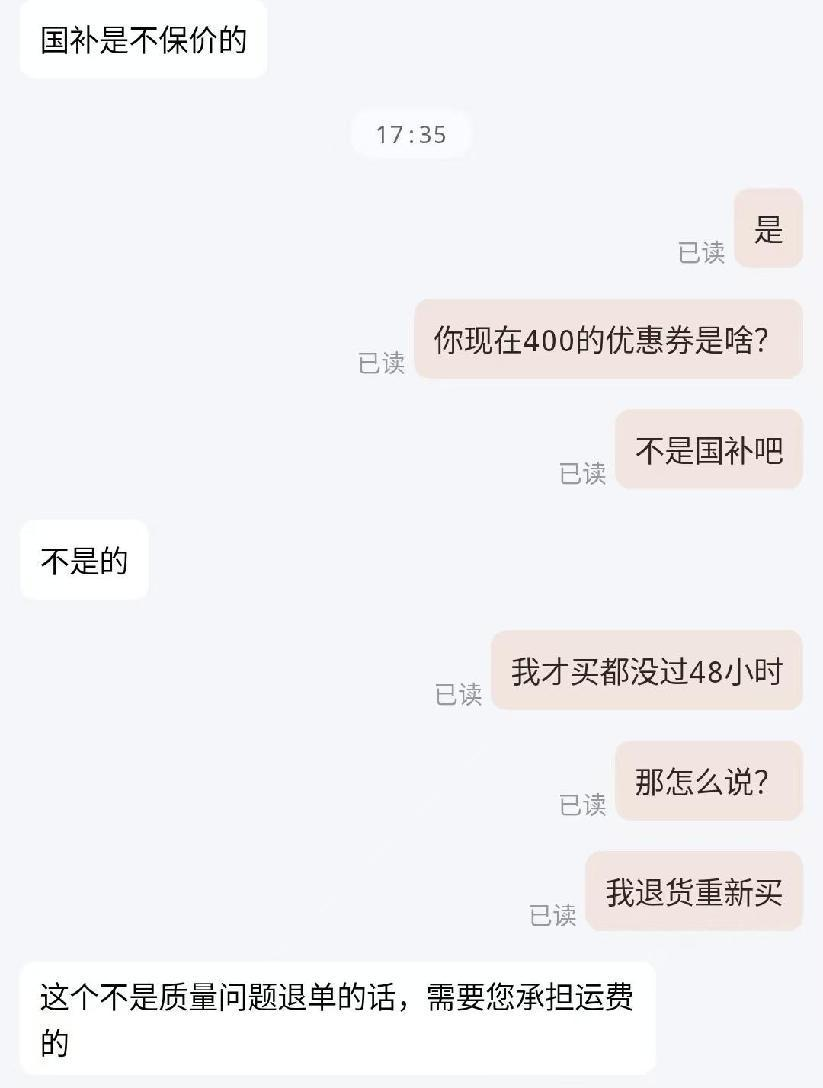 面對這突如其來(lái)的降價(jià),李先生深感憤怒與無(wú)奈。他嘗試通過(guò)平臺客服協(xié)調退還差價(jià),但得到的答復卻是:由于產(chǎn)品享受了政府補貼,差價(jià)不予退還。李先生氣憤地表示:“有種被當傻子耍的感覺(jué)?!苯?jīng)過(guò)多次溝通,李先生最終與客服協(xié)商達成了無(wú)條件退貨的協(xié)議,退貨運費由平臺承擔。隨后,李先生又用家人的賬號領(lǐng)取政府補貼后,加上新的活動(dòng)優(yōu)惠,以低于原購買(mǎi)價(jià)500元的價(jià)格于同一網(wǎng)購平臺再次購買(mǎi)了同一款空氣凈化器。