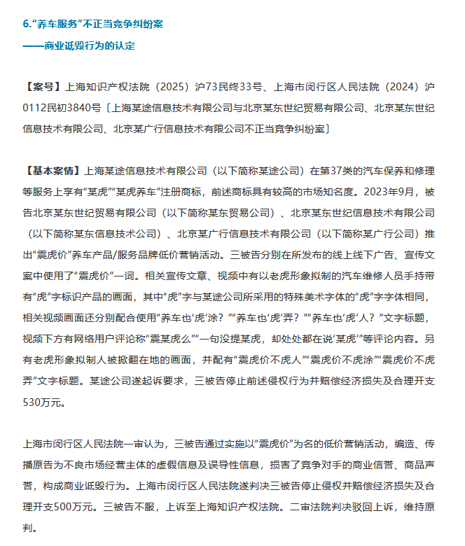 2025年9月8日,最高人民法院發(fā)布了八個(gè)反不正當競爭典型案例,其中影響較大的是上海知識產(chǎn)權法院二審、上海市閔行區人民法院一審判決的不正當競爭糾紛一案,案件的被告主體為北京京東世紀信息技術(shù)有限公司、北京汽廣行信息技術(shù)有限公司、北京京東世紀貿易有限公司(以下共同稱(chēng)“京東養車(chē)”),法院生效判決京東養車(chē)因商業(yè)詆毀與虛假宣傳構成不正當競爭,該判決為市場(chǎng)內經(jīng)營(yíng)者之間的競爭行為邊界提供了明確的司法指引,具有典型意義。