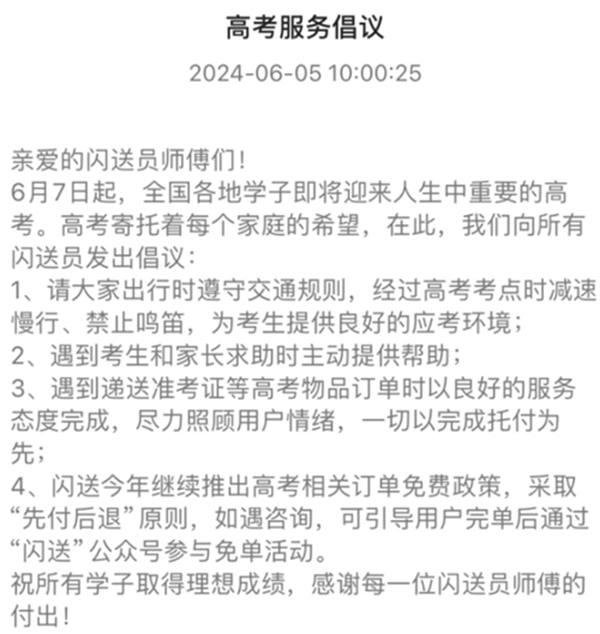 此外,閃送也向全國超過(guò)255萬(wàn)閃送員發(fā)出倡議,號召騎手在高考期間文明騎行,主動(dòng)向考生和家長(cháng)提供幫助,用最好的精神面貌服務(wù)用戶(hù),為高考加油。