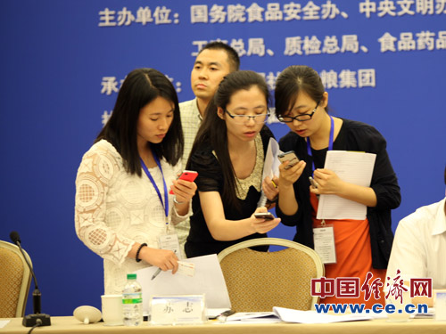 2013年全國食品安全宣傳周啟動(dòng)儀式暨第五屆中國食品安全論壇6月17日在北京舉辦,今年主題為“社會(huì )共治 同心攜手維護食品安全”。圖為參會(huì )記者進(jìn)行交流。中國經(jīng)濟網(wǎng) 王耀峰/攝